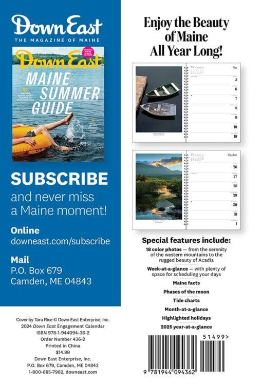 Down East knows Maine inside and out, and our engagement calendar for 2024 perfectly captures the mystique and beauty of the state. Tide tables, moon phases, important holidays, week-at-a-glance with plenty of space for scheduling your days, Maine facts, month-at-a-glance, and 2025 year-at-a-glance are also included.