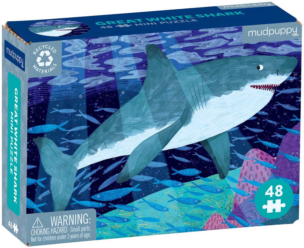 A two-sided insert includes a larger image of the puzzle and fun facts about the Great White Shark!